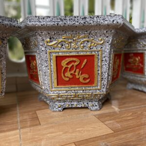 Chậu cây cảnh xi-măng lục giác với sáu cạnh và sáu góc, tạo nên một hình dạng đa diện độc đáo.