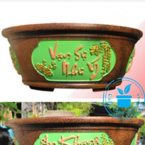 Chậu cây cảnh xi-măng tròn với họa tiết nổi : VẠN SỰ NHƯ Ý – AN KHANG THỊNH VƯỢNG – CÀNH MAI VÀNG : tạo nên một hình dạng đa diện độc đáo phù hợp với ngày tết.